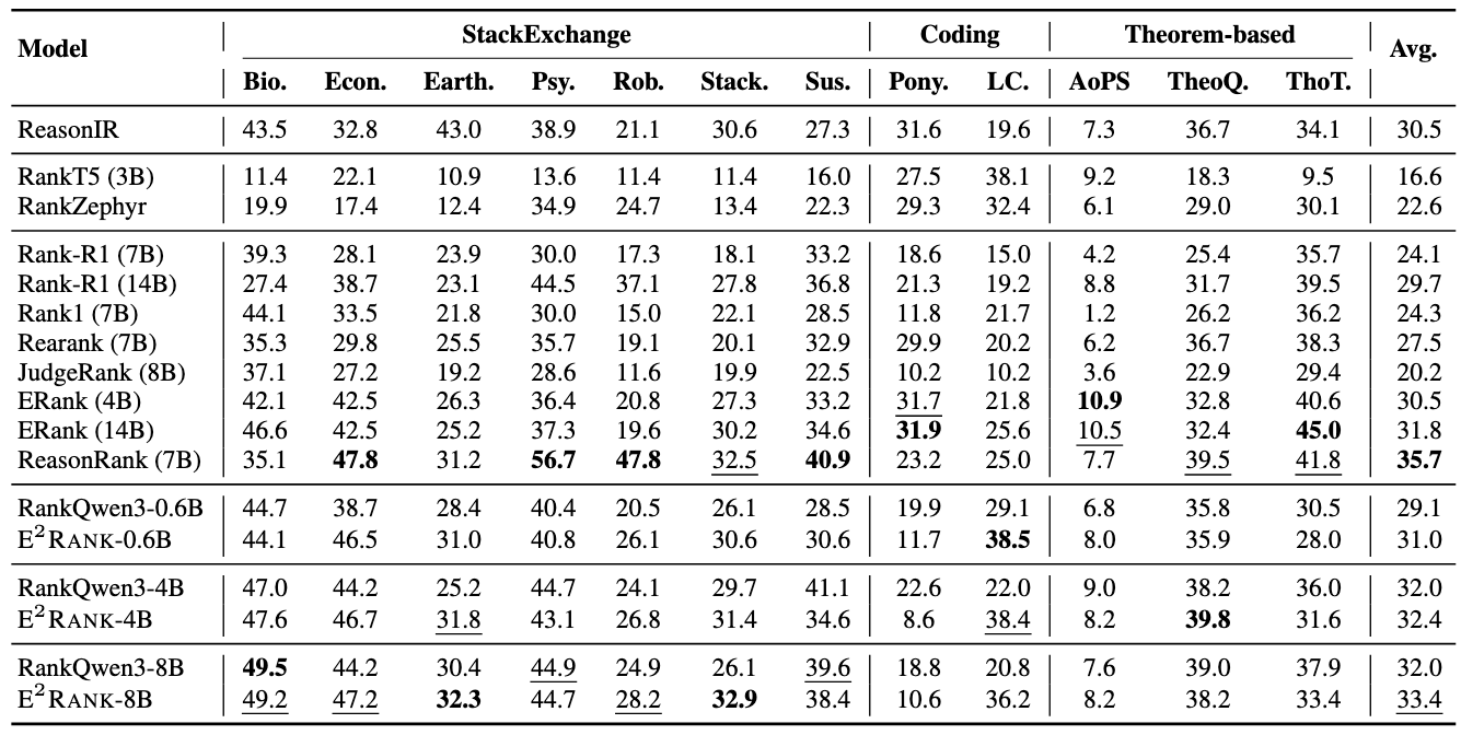 Additionally, E2Rank delivers strong results on the reasoning-intensive BRIGHT benchmark, without any RL training and training data synthesis, showcasing its versatility across diverse ranking scenarios.