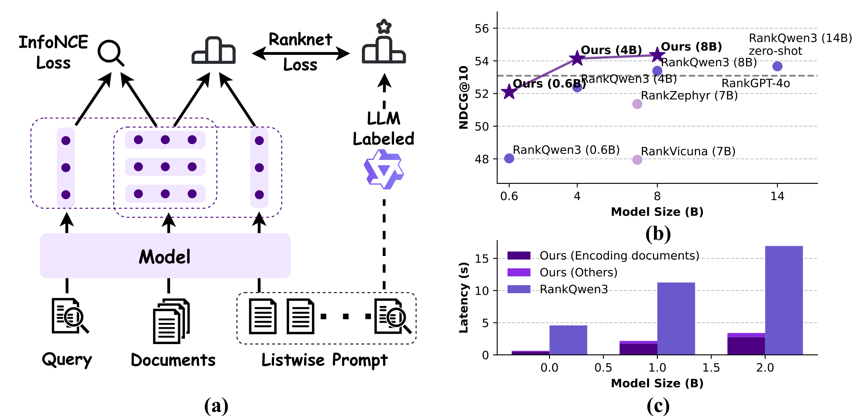 Effectiveness. As shown in Figure (b), E2Rank achieves state-of-the-art performance on the BEIR benchmark. It consistently RankQwen3 and approaches, demonstrateing that a single embedding model, when properly trained, can perform high-quality listwise reranking without relying on heavyweight generative architectures.