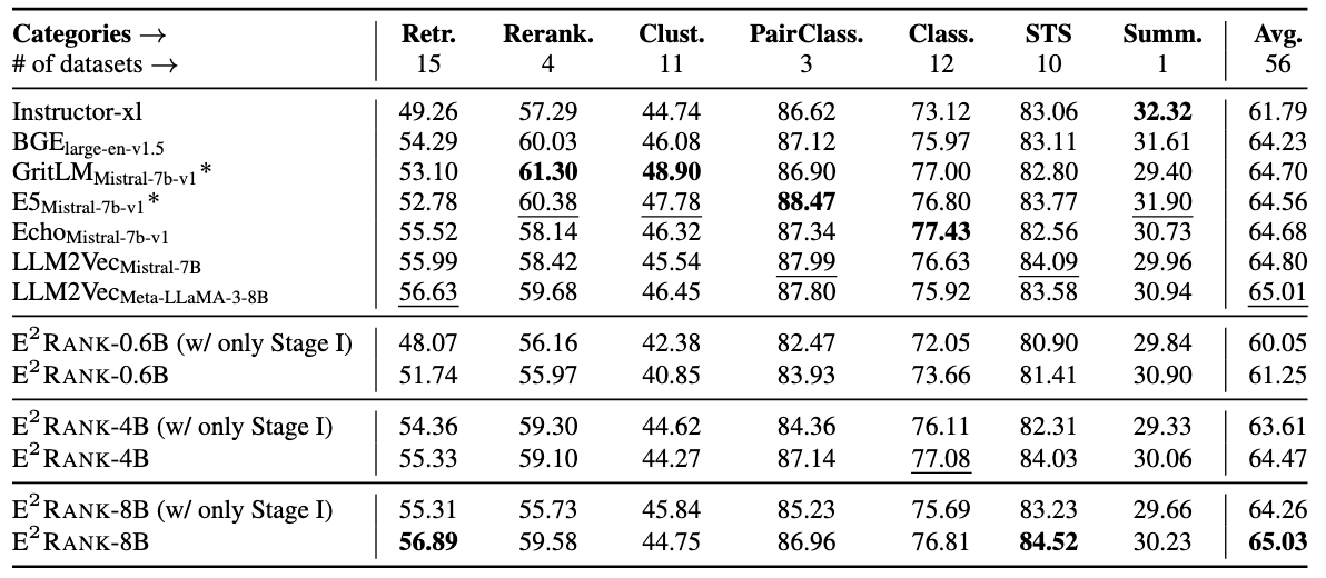 Beyond reranking gains, on the MTEB benchmark, E2Rank demonstrates strong embedding capabilities, while E2Rank-8B shows slight performance advantages on average compared to previous advanced models. Notably, compared with the variant with only contrastive learning, distilling from richer ranking signals will bring consistent and significant enhancements in retrieval tasks , demonstrating the effectiveness of the ranking objective.
